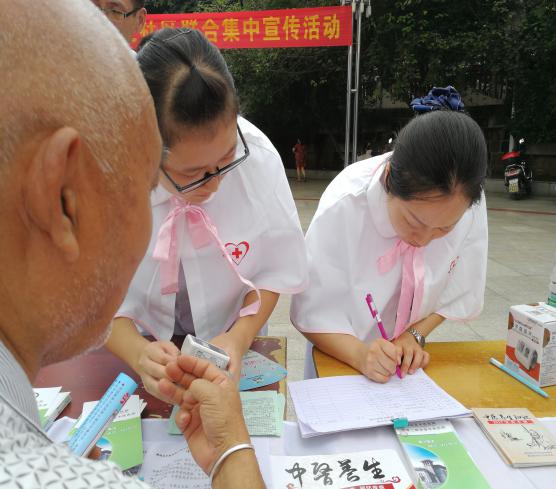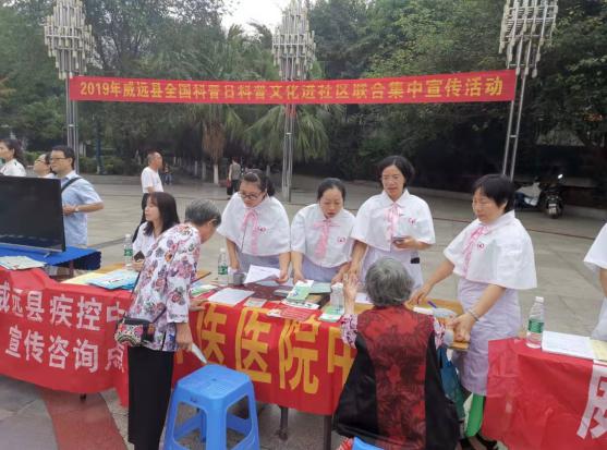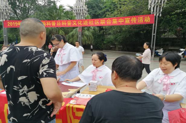 2019年是中华人民共和国成立70周年,是全面建成小康社会关键之年。根据国家及市县要求,我院护理专家志愿者团队及宣传科5人于9月12日上午,由护理志愿小分队队长唐德凤带队,与宣传科科长罗真洪一起共赴威远县严陵镇滨河广场参加“威远县二0一九年全国科普日活动”。活动主题:“礼赞共和国、智慧新生活”,“礼赞共和国七十华诞、建设幸福美丽威远”。我院结合主题思想开展助力健康中国公众健康知识普及行动,活动内容涉及义诊、健康咨询、糖尿病健康教育宣讲 、高血压健康教育宣讲、母乳喂养知识宣教、艾滋病预防、测血压、健康教育资料发放等8个方面的内容。