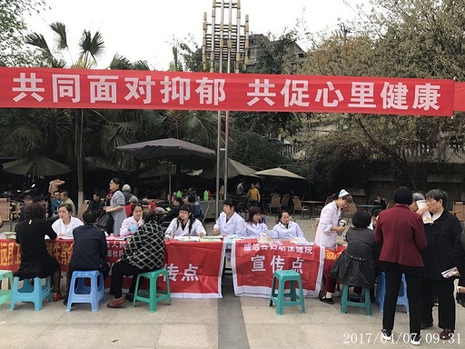 2017年4月7日上午9点,我院西街门诊部医生宋健和住院部骨科护士长罗秀丽,在滨河公园开展了以“一起来聊聊抑郁症”为主题的宣传活动,向广大群众普及心理健康知识,倡导社会平等对待、关心关怀抑郁症等精神疾病患者,促使更多的抑郁者患者获得帮助。活动共有30余人参与,发放宣传资料200余份。 此次活动,广大群众积极参与,并帮助指导更多的群众正确科学的认识到了心理问题和精神疾病。